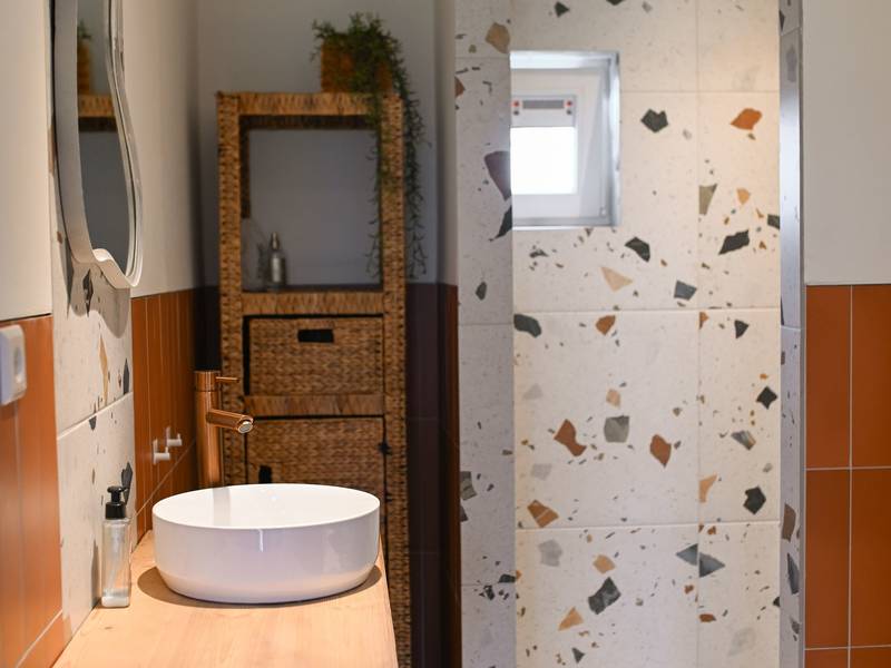 - In de badkamer met vloerverwarming vind je de inloop douche, wastafel en toilet