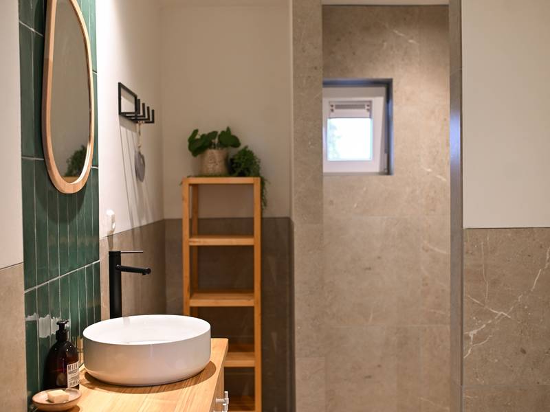 - In de badkamer met vloerverwarming vind je de douche, wastafel en toilet