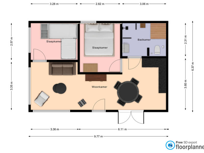 Het huisje heeft een gezellige houten hoekkeuken met mooie ronde tafel, een woonkamer met grote ramen voor een prachtig uitzicht en een ruime badkamer met infrarood-sauna.