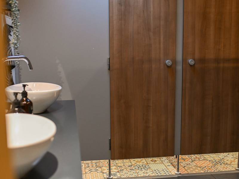 - Sanitair ruimte: twee inloopdouches, twee wastafels, twee wc's en één urinoir. Daarnaast nog één losse douche en één losse wc.