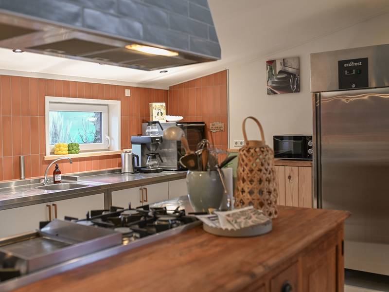 - De professionele keuken heeft twee gas-kookplaten, een grote koelkast, horeca vaatwasser, magnetron, grote heteluchtoven, vriezer, grote waterkoker en horeca koffiezetter (voor filterkoffie, filters zijn aanwezig)