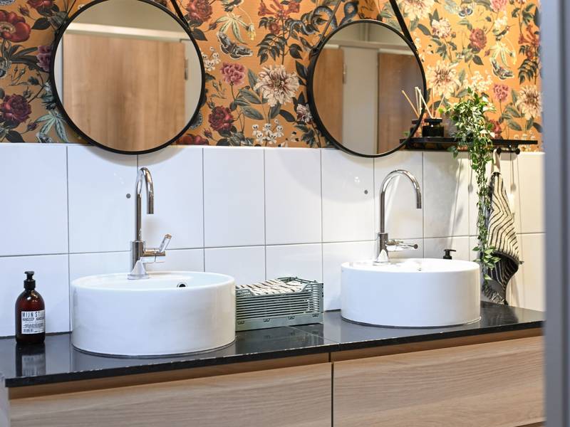 - Het sanitair: twee inloopdouches, twee wastafels, twee wc's en één urinoir