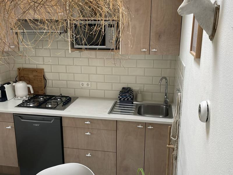 - De keuken is voorzien van 4pits gaskookplaat, koelkast met vriesvakje, magnetron, Ketelbinkie waterkoker en Nespresso-apparaat (startvoorraadje cups en theezakjes aanwezig)