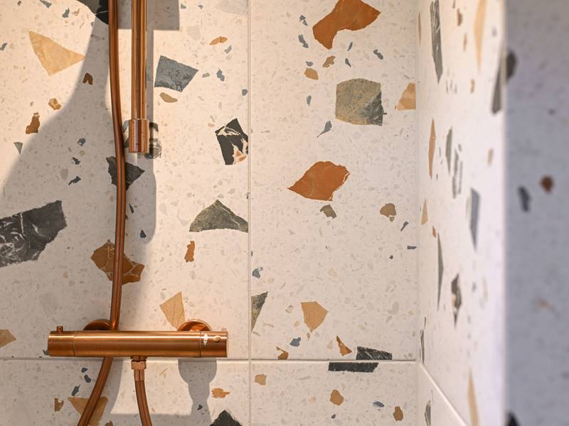 - In de badkamer met vloerverwarming vind je de inloop douche, wastafel en toilet