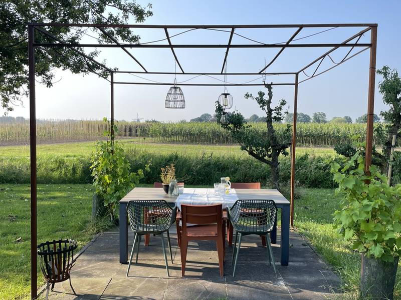 De grote buitenruimte die om dit huisje zit, is ook echt uniek voor een vakantiehuisje. Er is zelfs een heus Frans druiven-afdak!