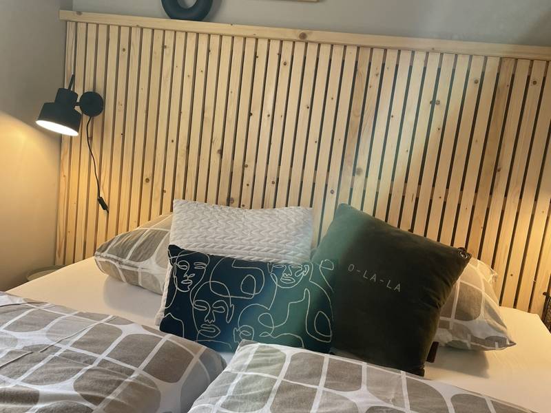 Met de warme houten vloer, de zelfgemaakte meubels, knusse slaapkamer (één met leuk speelplekjes voor de kids én een half-hoogslaper), sfeervolle zwarte keuken met barretje, mooie badkamer met regendouche en het houtkacheltje is dit echt een uniek vakantiehuisje geworden.
