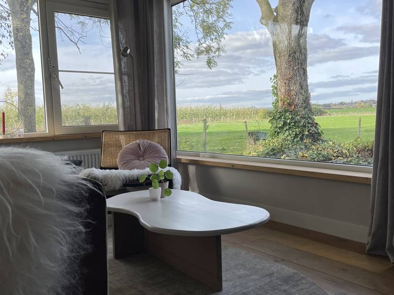 Door de grote ramen in de woonkamer en vanonder de overkapping heb je een prachtig uitzicht op de paardenwei met daarachter Rhenen.