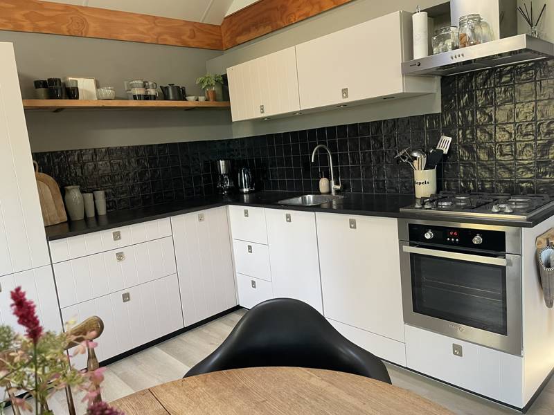 Het thema van De Peppel is natuur&stoer. Een mooie hoekkeuken met stoere zwarte tegeltjes, een leren bank en rustige hout-look-vloer... gezellig en sfeervol.